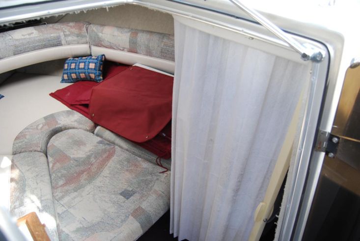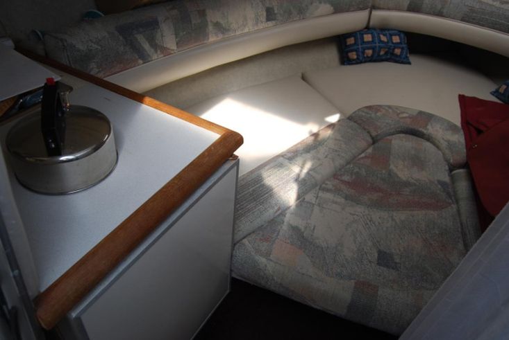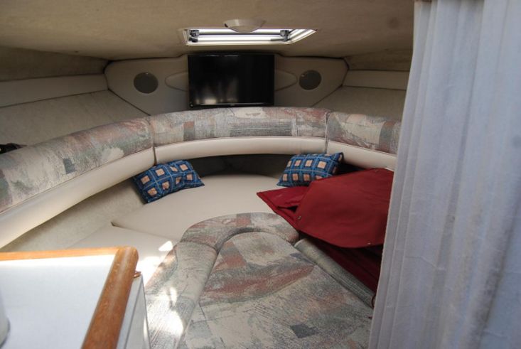 Sound system with speakers. Galley with 12v refrigerator. Heads with chemical toilet and pull-across blind. TV.
